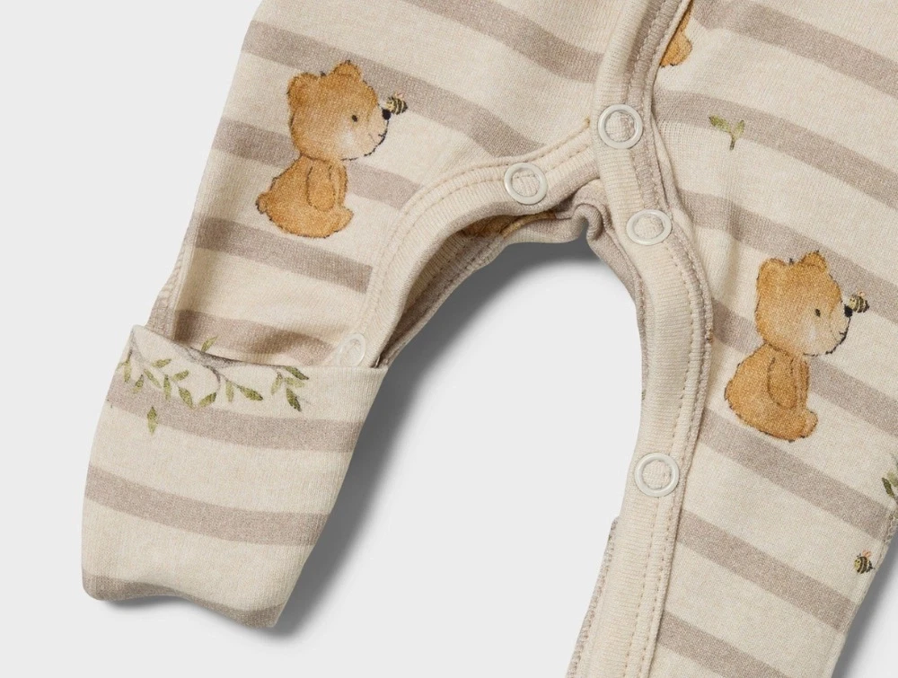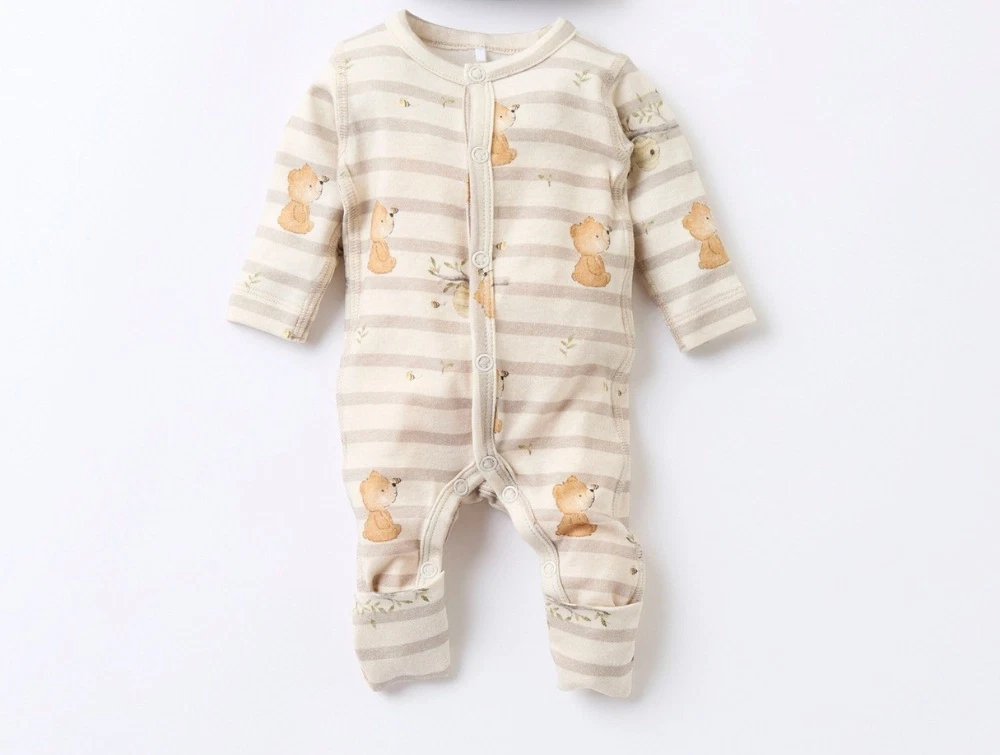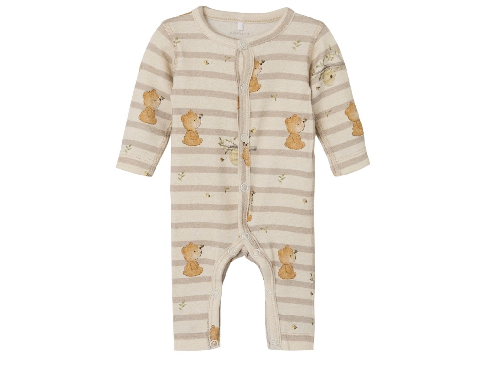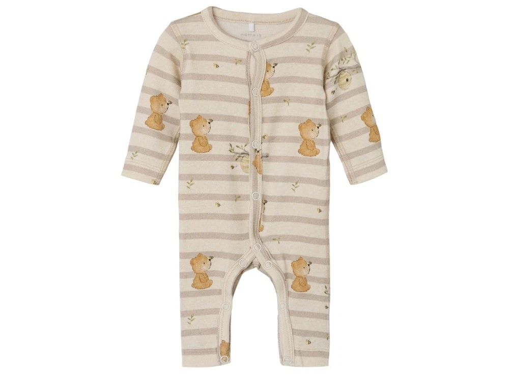 Heldragt i beige nuance fra Name It med sødt bjørneprint og striber. En blød og praktisk heldragt i jerseykvalitet, ideel til både dag og nat.