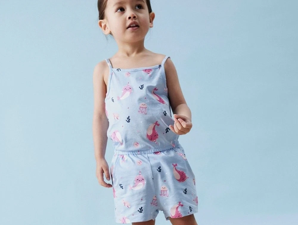 Sød og sommerlig heldragt med stropper og korte ben fra Name It i en smuk lyseblå farve med print af hvaler og andre havmotiver i mørkeblå, hvide og pink nuancer. Modellen har to sidelommer, elastik i taljen og trykknaplukning mellem benene.