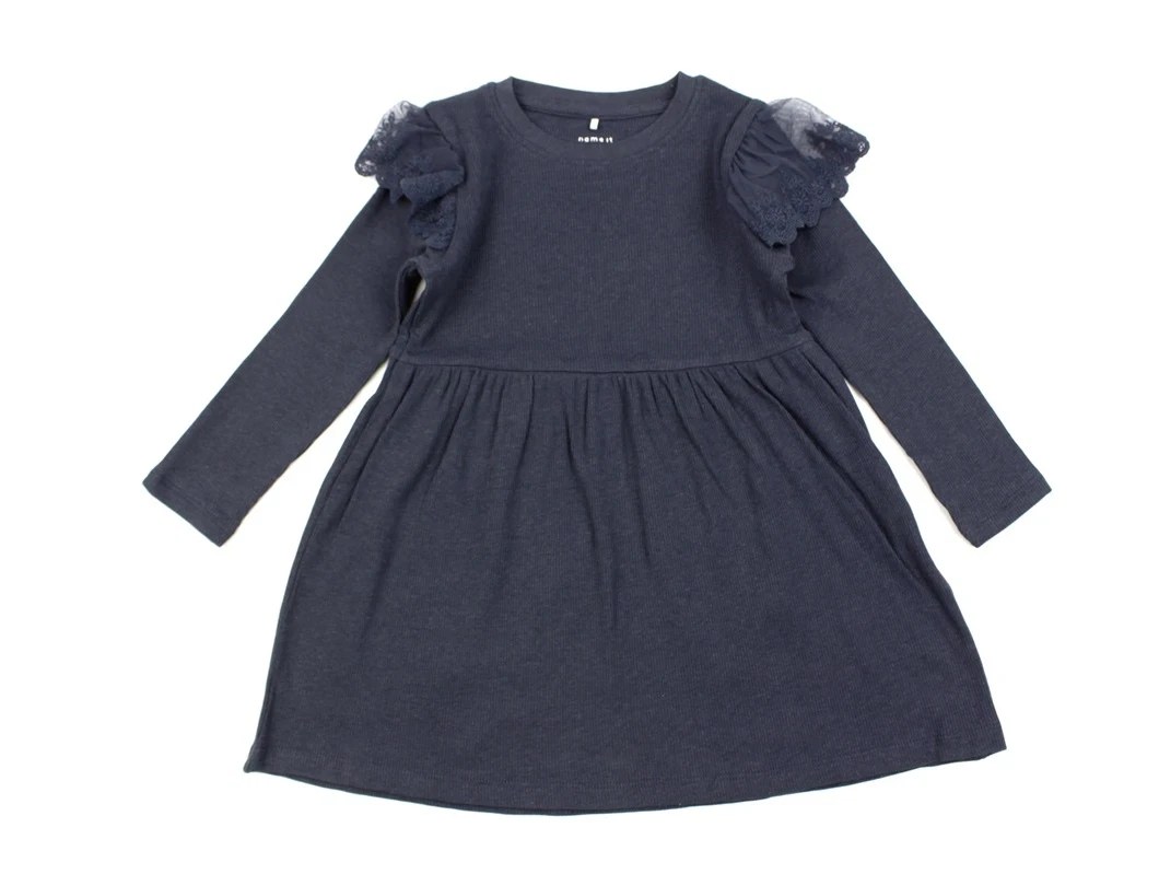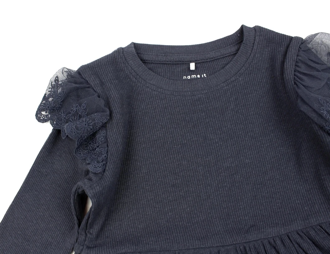 Kjole i ribkvalitet i farven india ink med blonder på skuldre fra Name It.