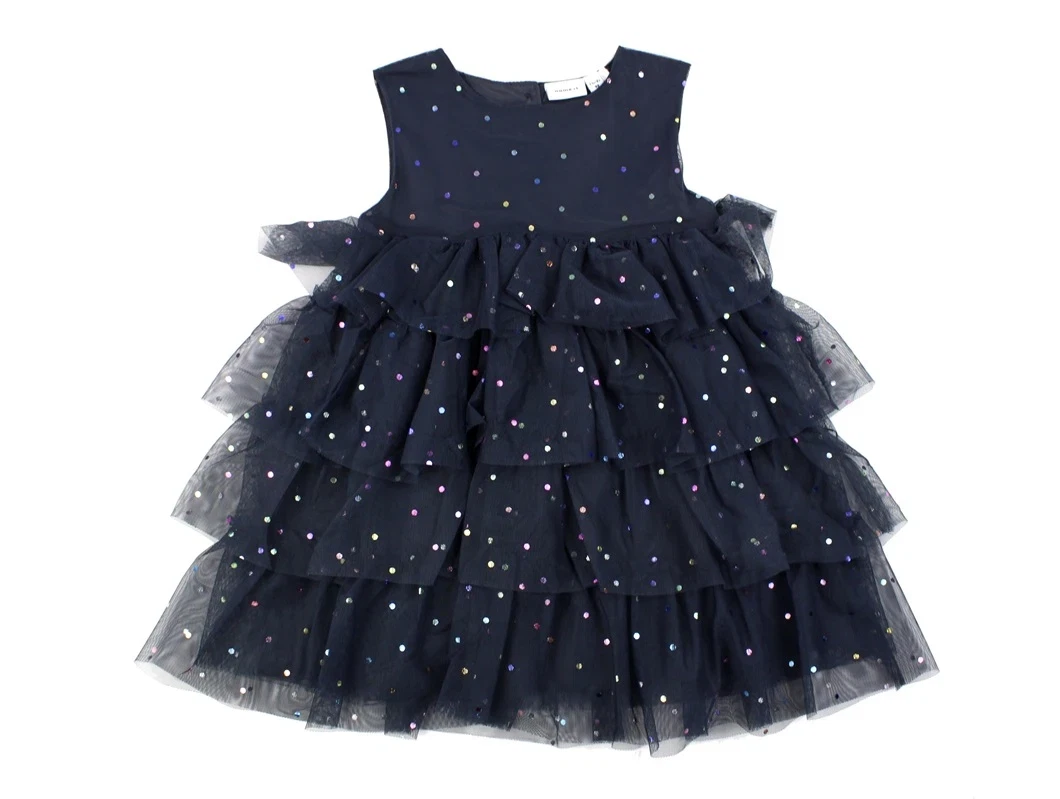 Kjole i farven india ink med multifarvede glimmerprikker fra Name It.
