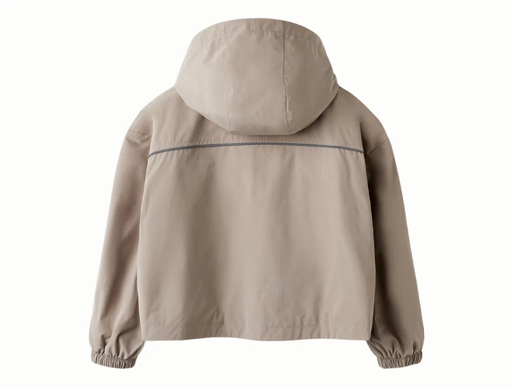 Modellen har høj hals, aftagelig hætte og diskrete refleksdetaljer, som gør den velegnet som overgangsjakke. Indvendigt i hætten ses et leopardmønstret foer, der giver en fin kontrast. Jakken har almindelig pasform og en let, praktisk konstruktion.