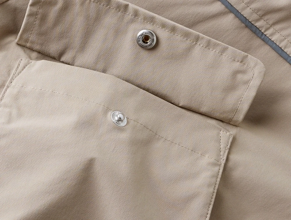 Jakken lukkes med gennemgående lynlås med hagebeskytter og har elastik ved håndleddene, som slutter tæt. De store frontlommer med klap og trykknap giver plads til småting. Hætten kan tages af for øget sikkerhed, og den vandafvisende overflade er behandlet med BIONIC-FINISH® ECO uden brug af fluorstoffer.