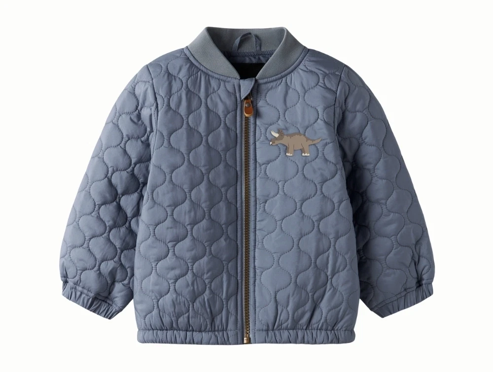 Quiltet jakke i blå nuance (Flint Stone) fra Name It med fine dinosaurdetaljer foran og stort broderi på ryggen.