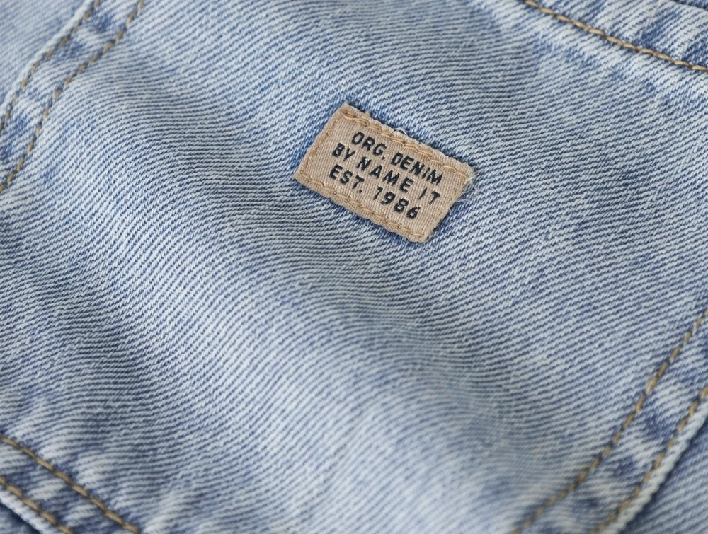 Denimbukserne er fremstillet i 100% bomuld (økologisk), hvilket giver en blød og fleksibel kvalitet. Elastik i taljen og snøre gør det nemt at tilpasse pasformen, mens materialet føles behageligt mod huden og giver god bevægelsesfrihed.