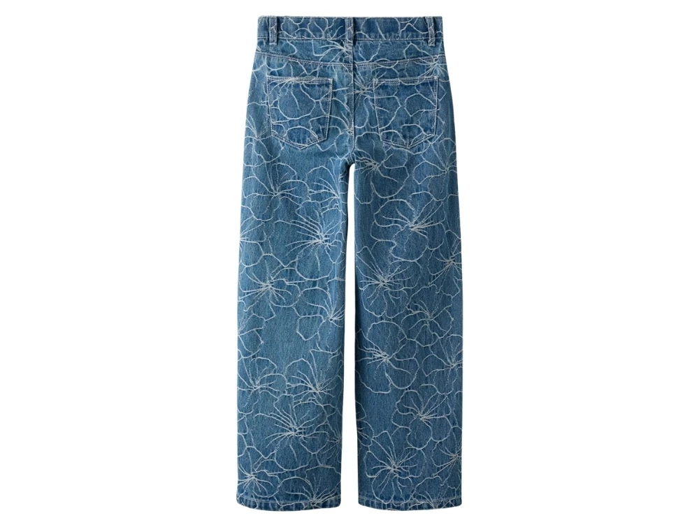 Name It jeans i blå denim med blomster jacquardName It jeans medium blue denim med vævet blomster mønsterName It jeans medium blue denim detalje af blomster jacquardName It jeans medium blue denim set bagfra med blomster mønster