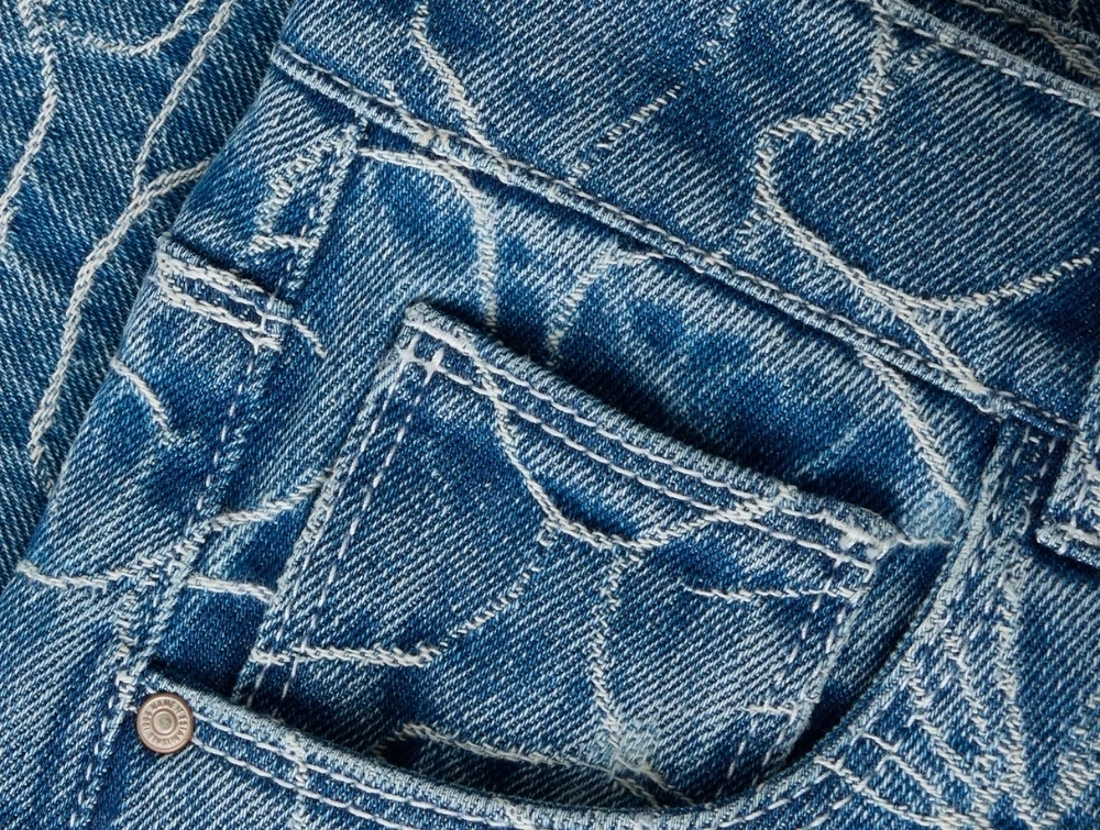 Modellen er fremstillet i denim med et vævet blomsterdesign, der giver stoffet et tydeligt og dekorativt mønster.