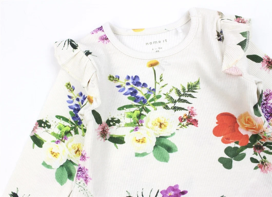 Kjole i farven jet stream med blomsterprint og flæser fra Name It.