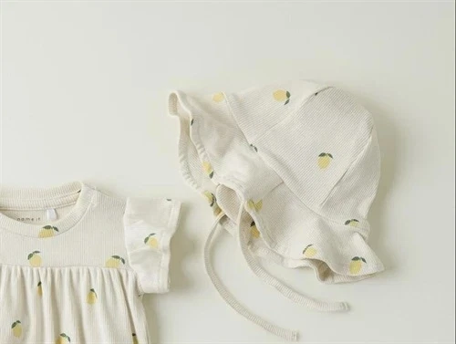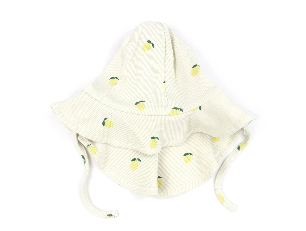 Sommerhat med bindebånd og øreklapper i farven jet stream med citronprint fra Name It.