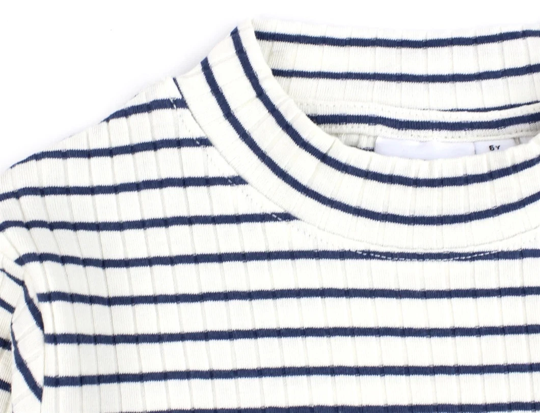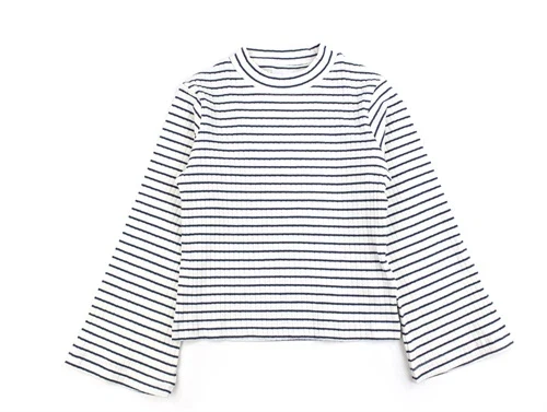 Blød stribet bluse i rib i farverne jet stream og dark denim med trompetærmer fra Name It.