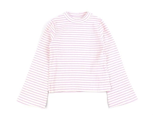 Blød stribet bluse i rib i farverne jet stream og pastel lavender med trompetærmer fra Name It.