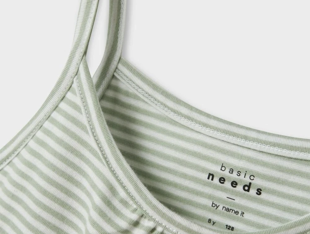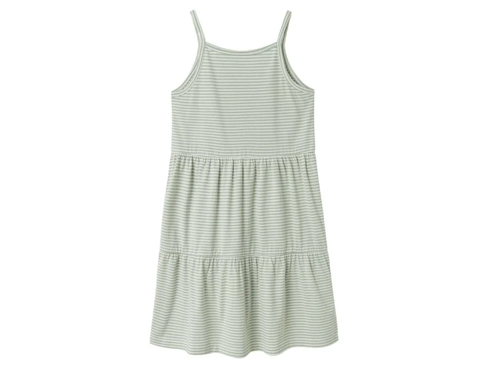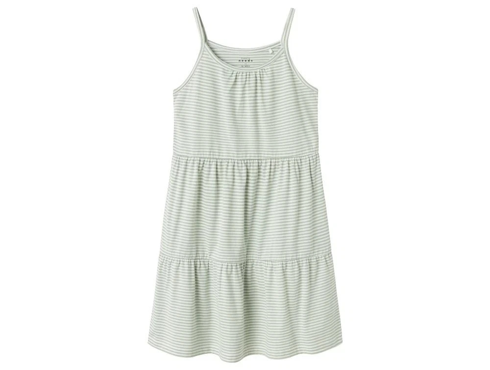 Kjole i lysegrønne og hvide striber fra Name It med tynde stropper og søde rynkedetaljer – en let style til varme dage.