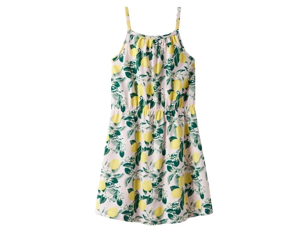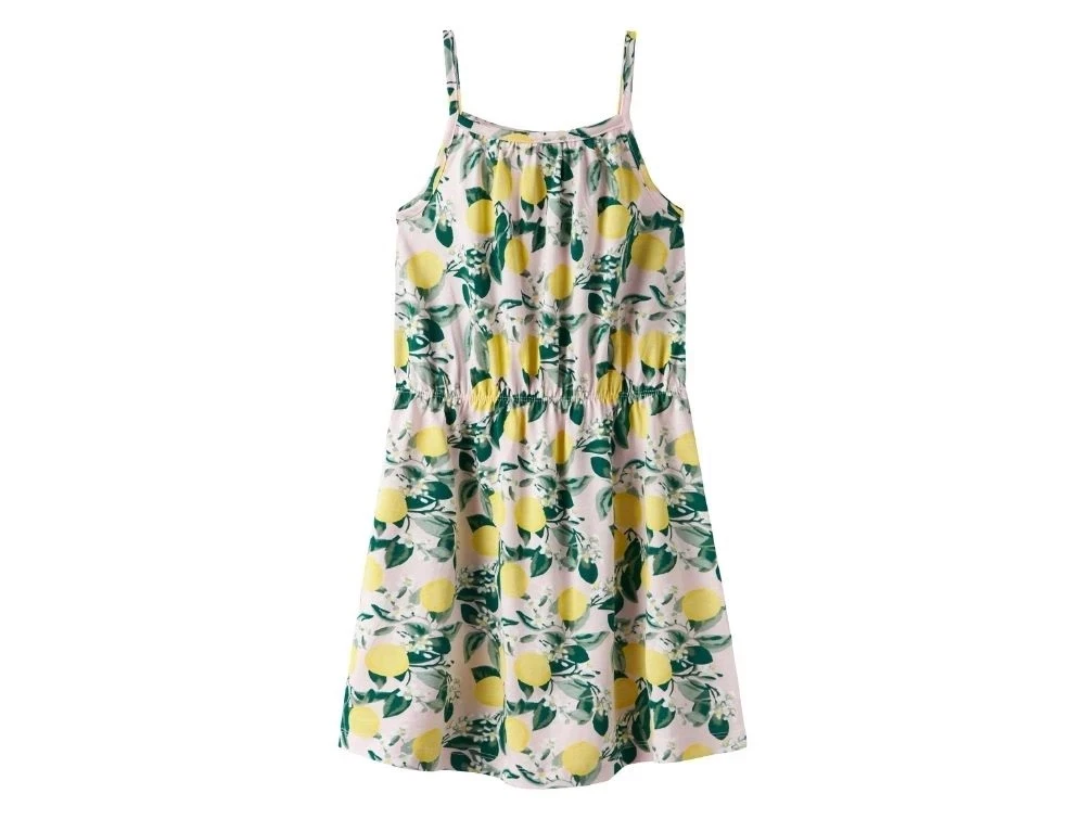 Denne ærmeløse sommerkjole er fremstillet i blød bomuldsjersey med rund hals og tynde stropper. Kjolen har et smock-syet taljestykke og vidde i skørtet, hvilket giver en let og luftig silhuet.