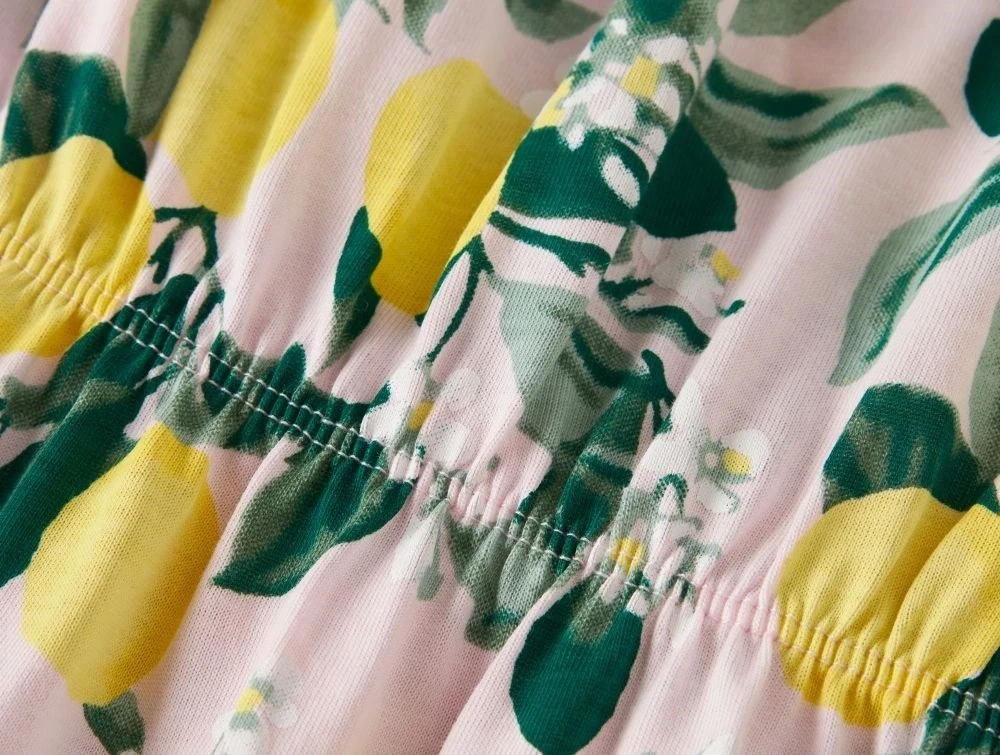 name it kjole i lys rosa med citronprint, set forfraname it kjole i lys rosa med citronprint, set bagfranærbillede af smockdetalje og citronprint på name it kjole i rosa