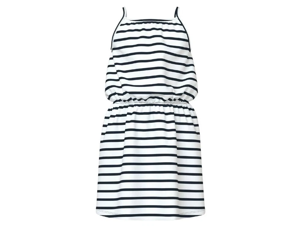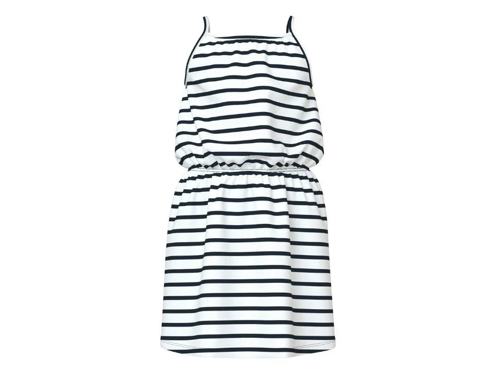 Kjole med hvide og mørkeblå striber og smalle stropper fra Name It i en blød bomuldskvalitet.