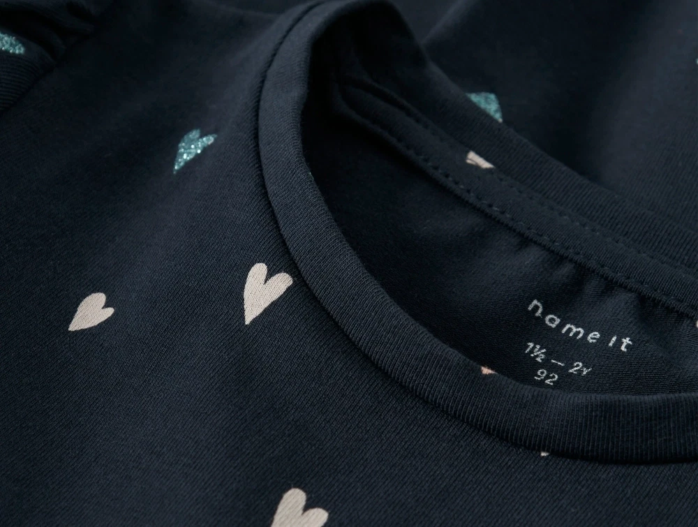 Name It kjole i dark sapphire med hjerteprint og lommerNærbillede af halsudskæring og hjerteprint på Name It kjole i dark sapphire