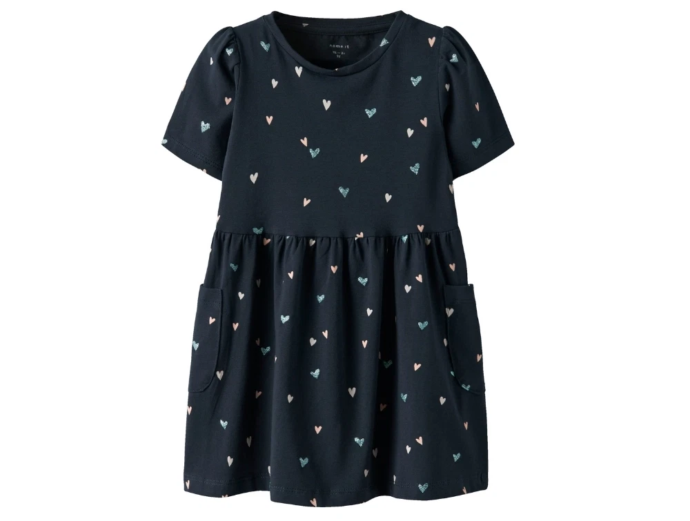 Kjole i mørk blå nuance (dark sapphire) fra Name It med sødt hjerteprint og praktiske lommer.