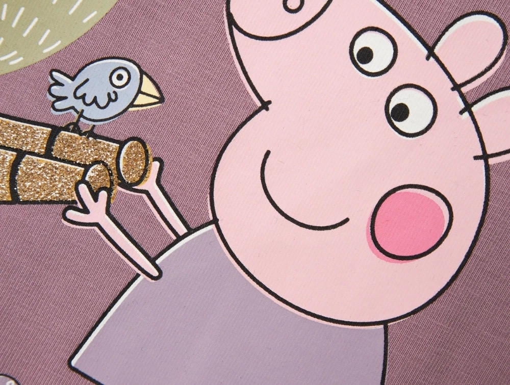 Pige iført Name It kjole i elderberry med Gurli Gris motivDetalje af Gurli Gris print med glitter på Name It kjole i elderberryName It kjole i elderberry med Gurli Gris print