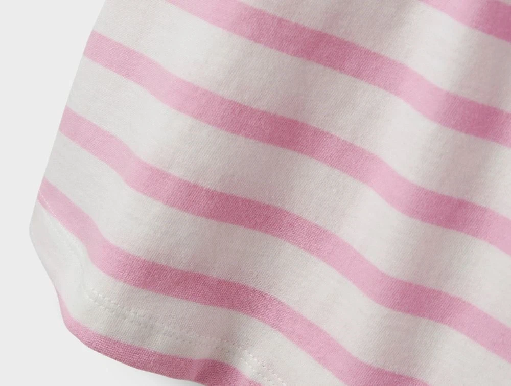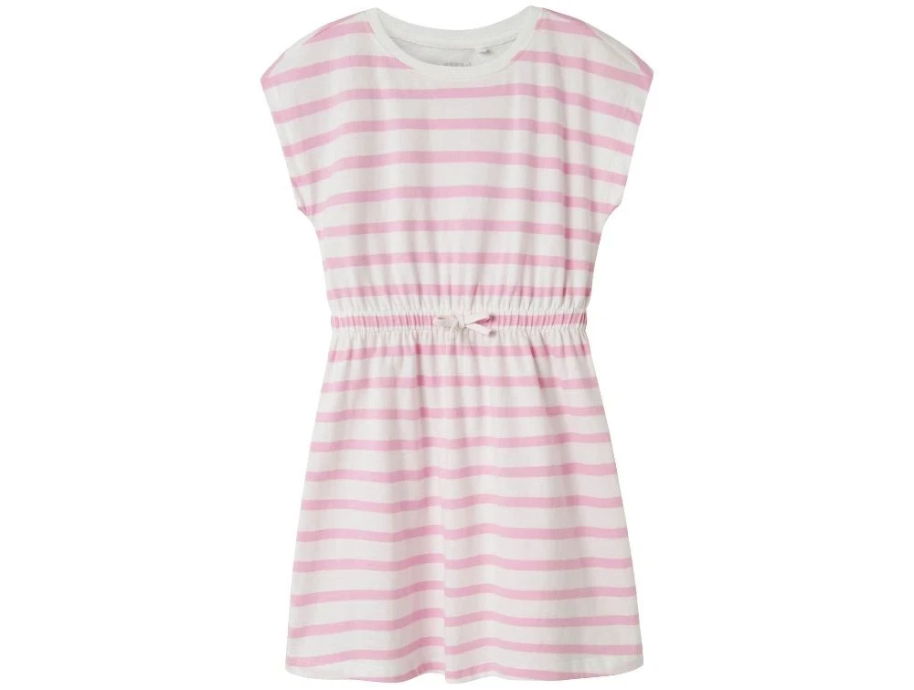 Sød og behagelig kjole fra Name It i hvid med pink striber. Kjolen er lavet af 100% bomuld, hvilket gør den blød, let og komfortabel at have på.