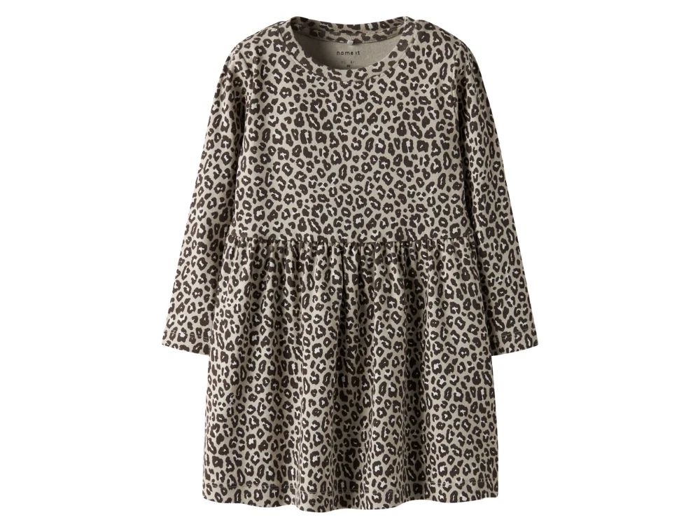 Kjole i beige nuance fra Name It med leopardprint over hele stoffet. Den bløde jersey kvalitet giver en behagelig pasform og gør kjolen oplagt til hverdagsbrug.