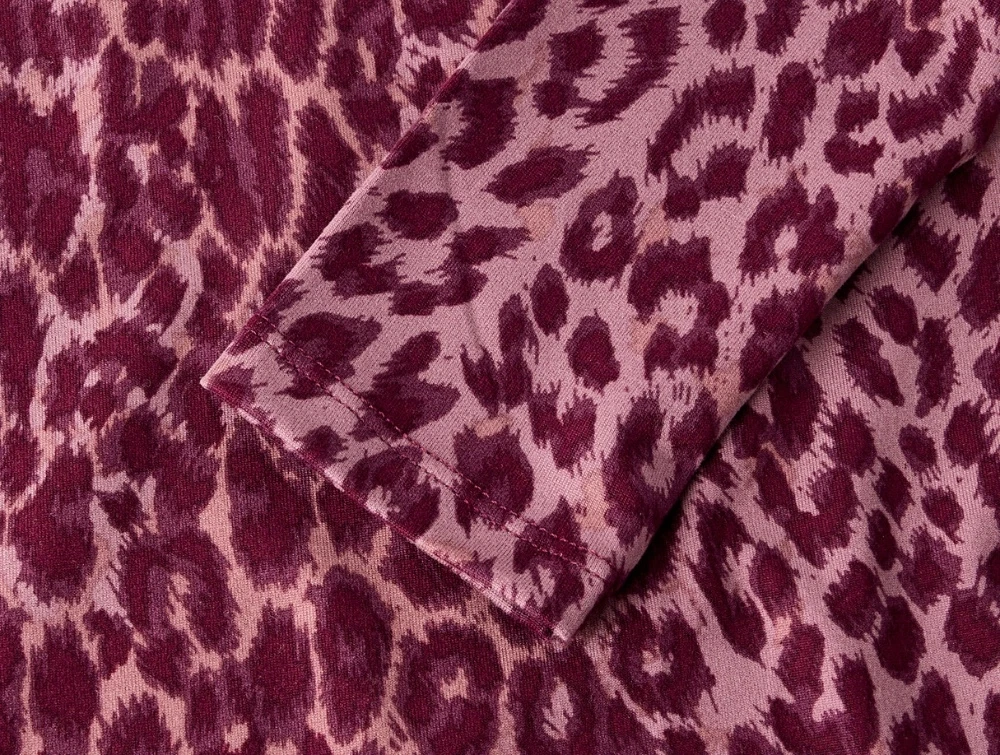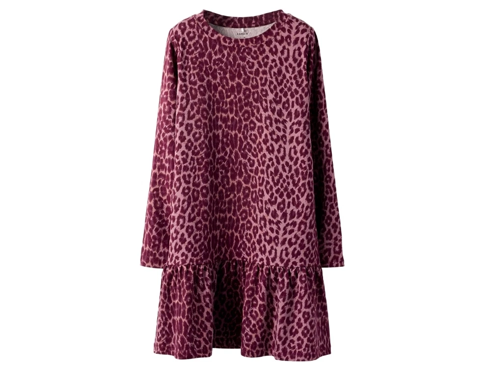 Name It kjole grape shake med leopardprint på modelName It kjole grape shake med leopardprint produktfotoDetalje af leopardprint på Name It kjole grape shake