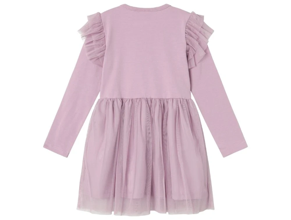 Lilla kjole med tylskørt og print med gabbys dukkehus fra Name It 13236208 lavender mistLilla kjole med tylskørt og flæser på skuldrerne i tyl fra Name It 13236208 lavender mistGabbys dollhouse print på lilla tylkjole fra Name It 13236208 lavender mist