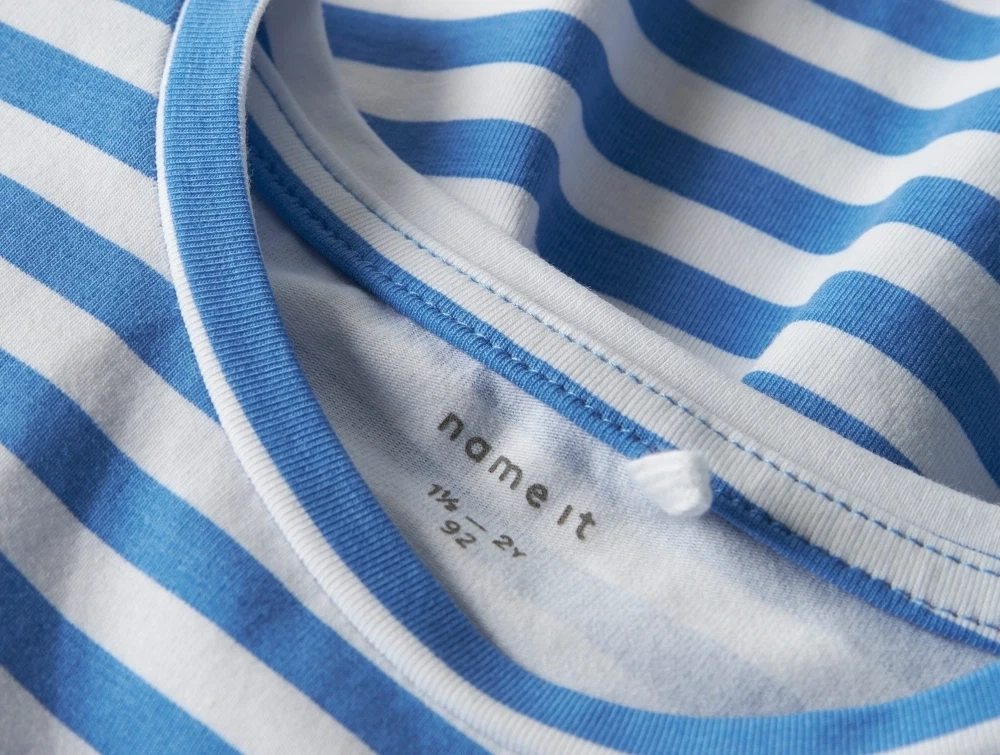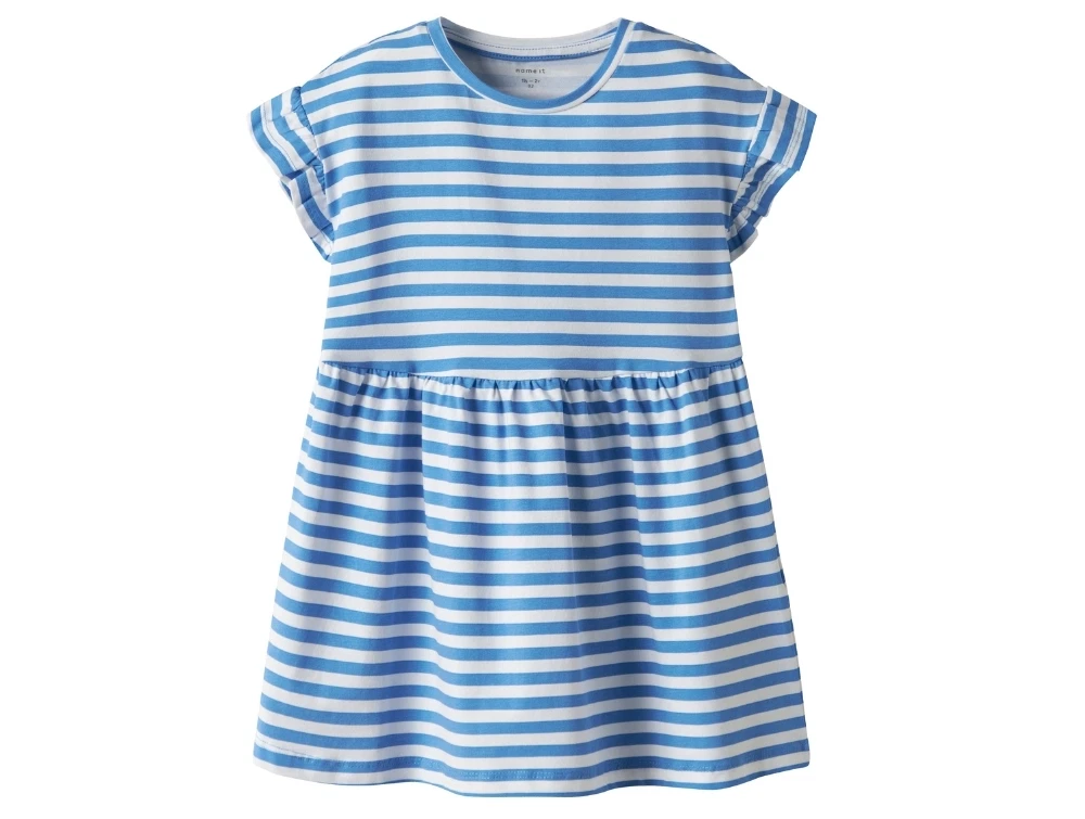 Kjole i klassisk blå-hvid stribet design (marina) fra Name It. Modellen har fine flæsedetaljer ved ærmerne.