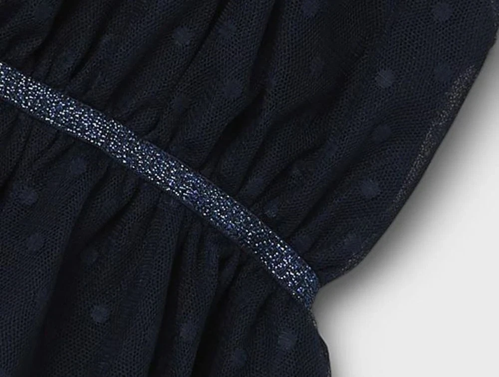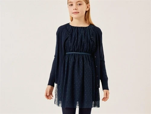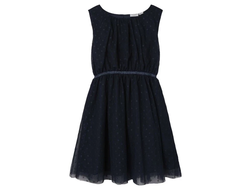 Smuk spencer-kjole fra Name It i en mørk sapphire-nuance med tone-i-tone detaljer og et elegant glitterbånd i taljen. Kjolen er lavet i let tyl, der giver et festligt udtryk, og har en blød polyesterforing, så den ikke er gennemsigtig.