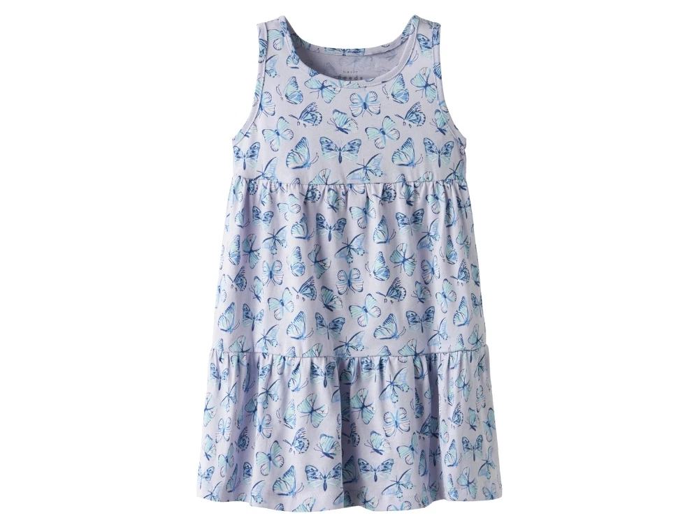Kjole i lilla nuance med sommerfugleprint fra Name It. Printet er spredt over hele stoffet og skaber et sødt, sommerligt udtryk.