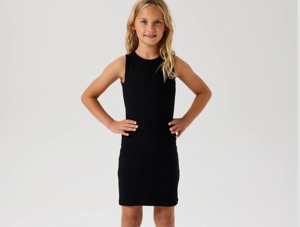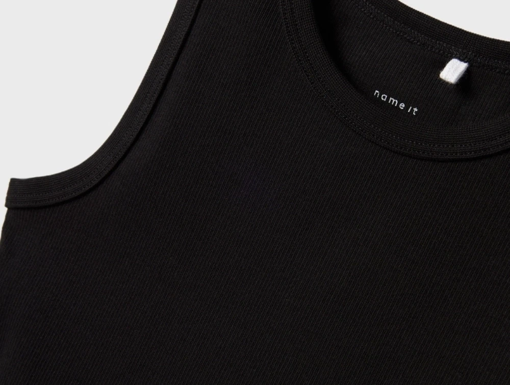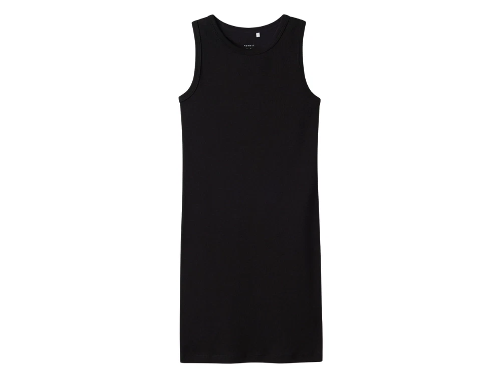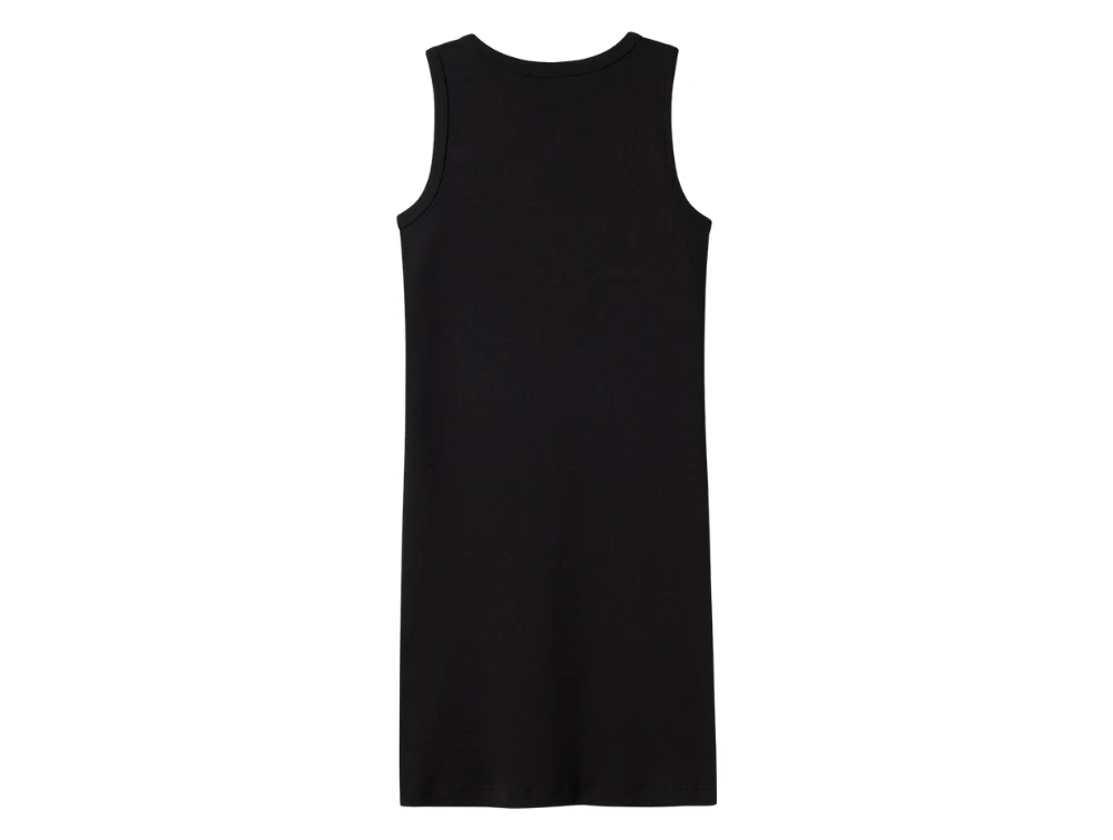 Name It kjole i sort rib til børnName It sort ribkjole uden ærmerName It kjole sort rib detalje af stofName It kjole sort rib set bagfra