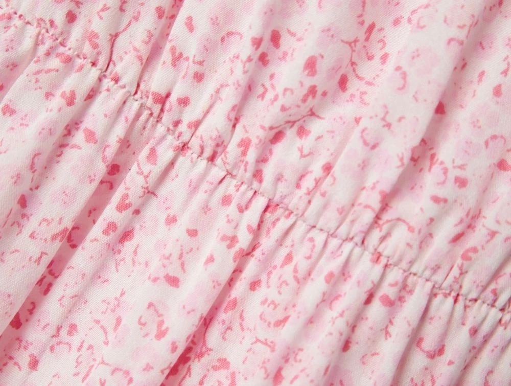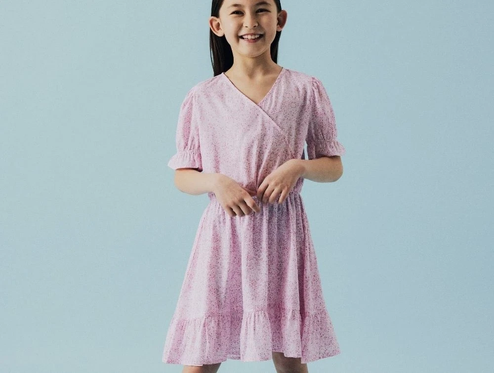 Kjolen er lavet i vævet polyester med en klassisk v-hals og korte ærmer. Den har elastik i taljen og en fin lukning med knap og løkke i nakken. Overfladen er dekoreret med et gentaget print over hele kjolen.