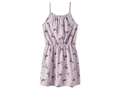 Kjole i lilla nuance fra Name It med farverigt fugleprint og tynde stropper.