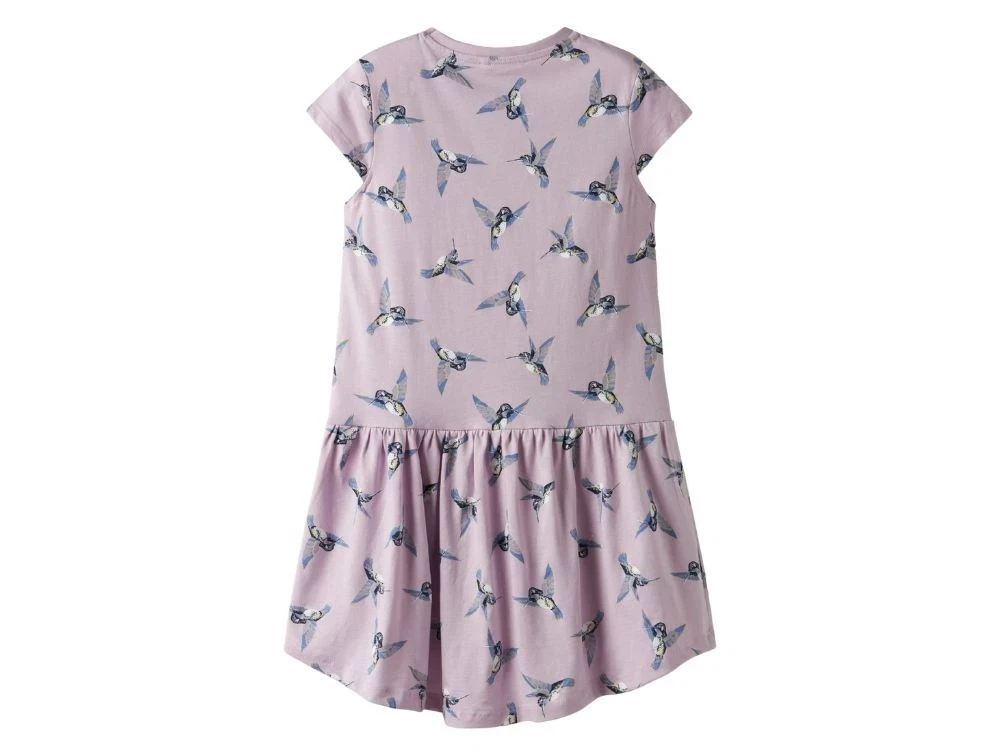 Kjole i lilla nuance fra Name It med all-over kolibri-print og rynket skørt
