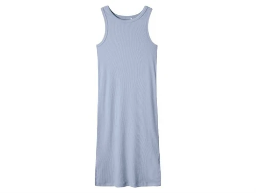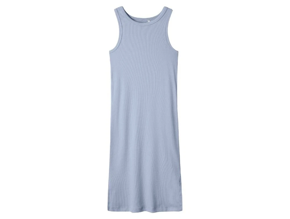 Lyseblå ribkjole fra Name It med rund hals og tætsiddende pasform.