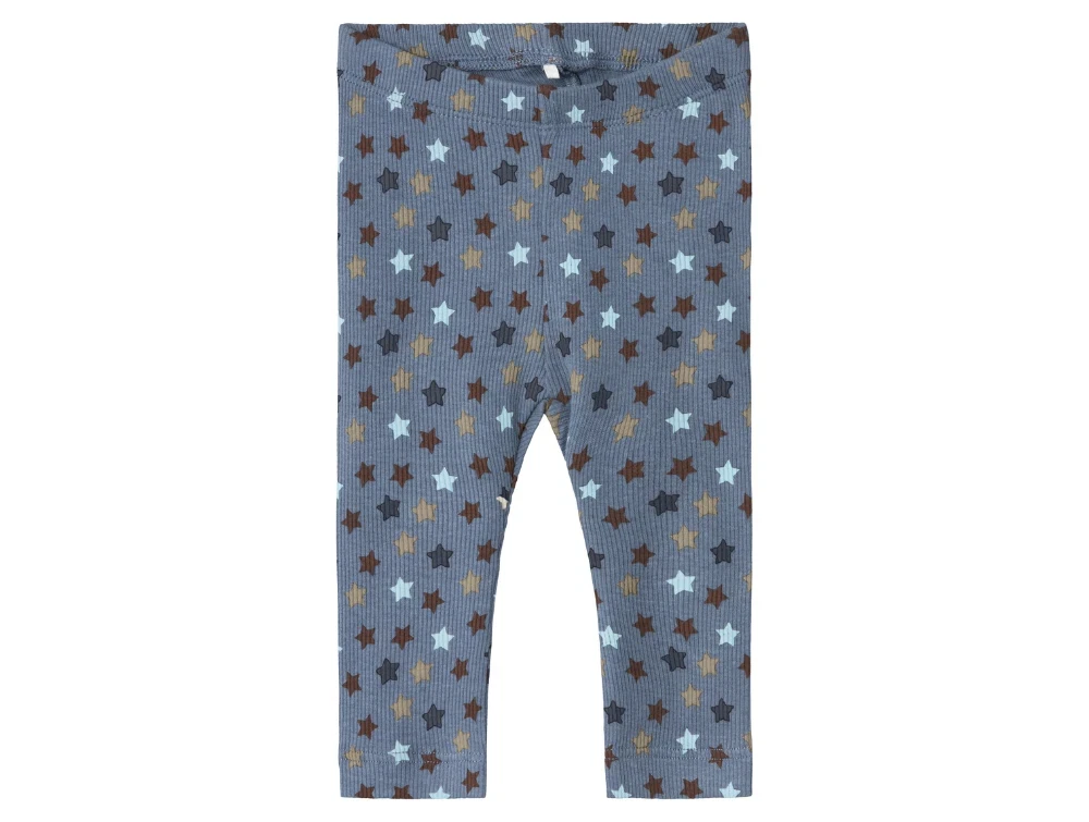 Leggings i en støvet blå nuance med et fint print af stjerner i blå og brune toner. De er lavet i en blød og strækbar ribkvalitet, som føles behagelig mod huden. Modellen har elastik i taljen og er velegnet til både hverdagsbrug og afslapning.