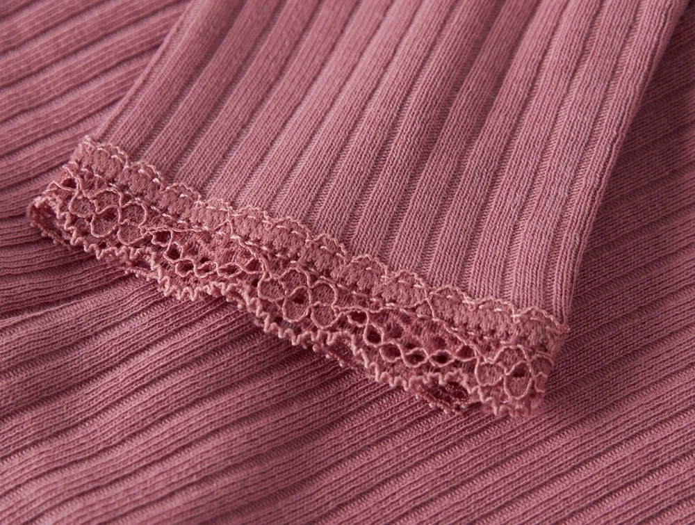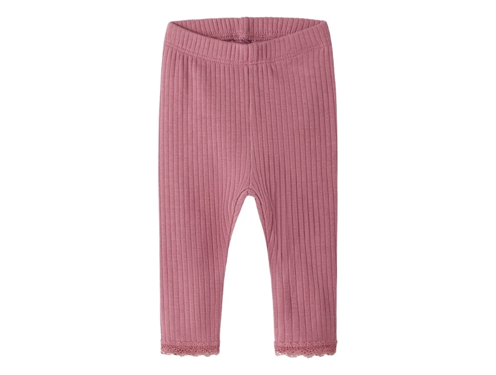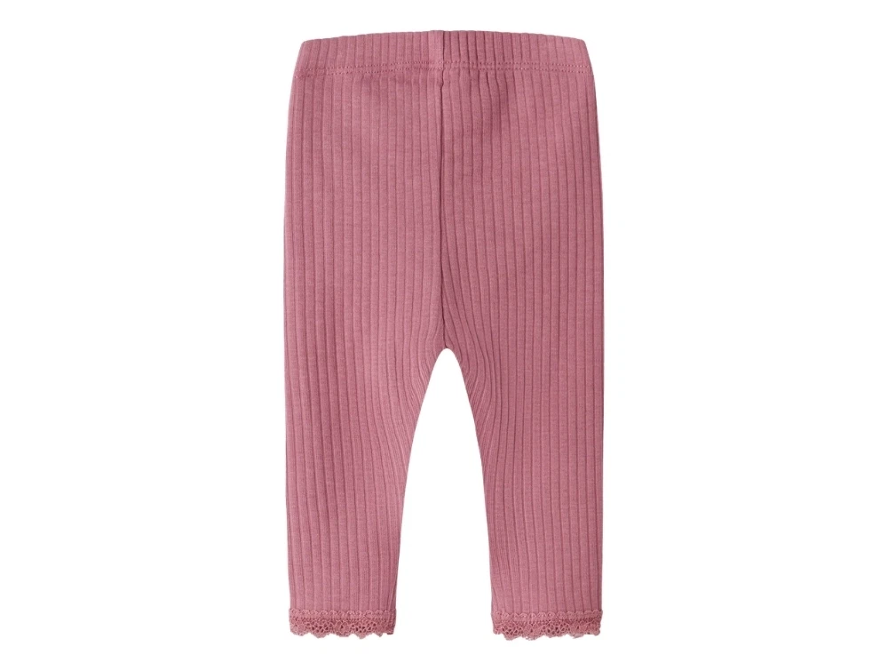 Leggings i rosa nuance (Mesa Rose) fra Name It med ribstruktur og blondekant ved benene.