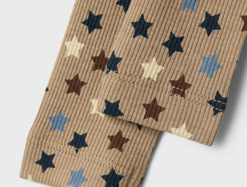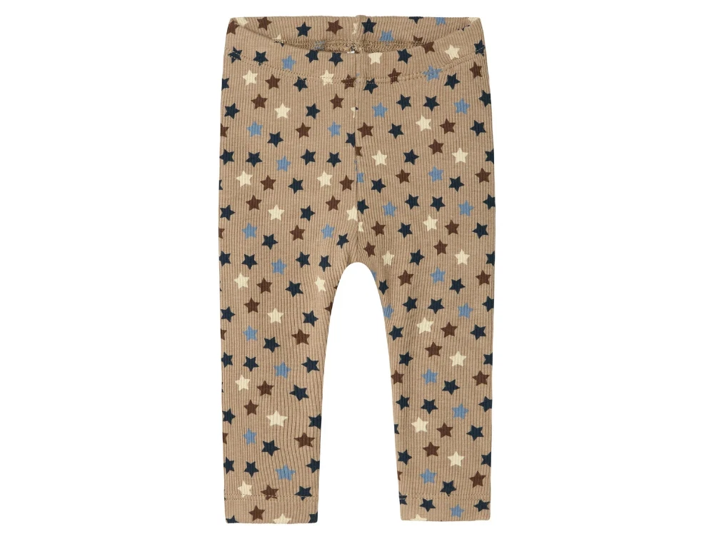 Leggings i en lys brun nuance med et fint print af stjerner i blå og brune toner. De er lavet i en blød og strækbar ribkvalitet, som føles behagelig mod huden. Modellen har elastik i taljen og er velegnet til både hverdagsbrug og afslapning.