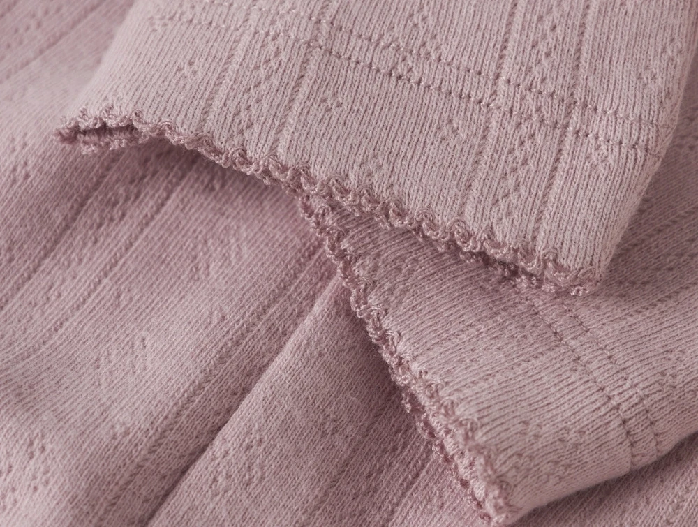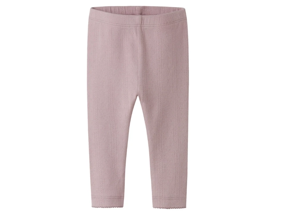 Leggings i lys lilla nuance (burnished lilac) fra Name It med fint hulmønster og elastik i taljen. Stoffet er blødt og strækbart, hvilket giver god bevægelsesfrihed og komfort i hverdagen.