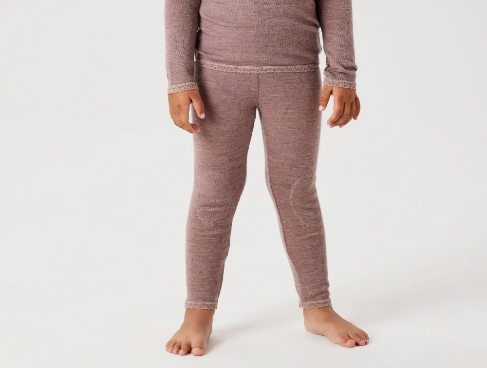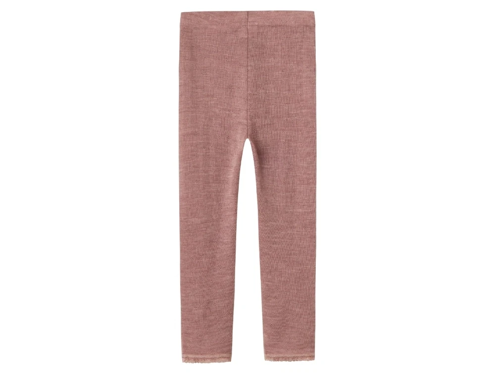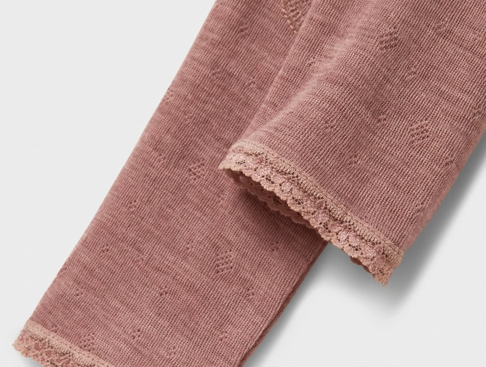 Leggings i støvet violet nuance (antler) fra Name It i merinould med hulmønster og blondekant.