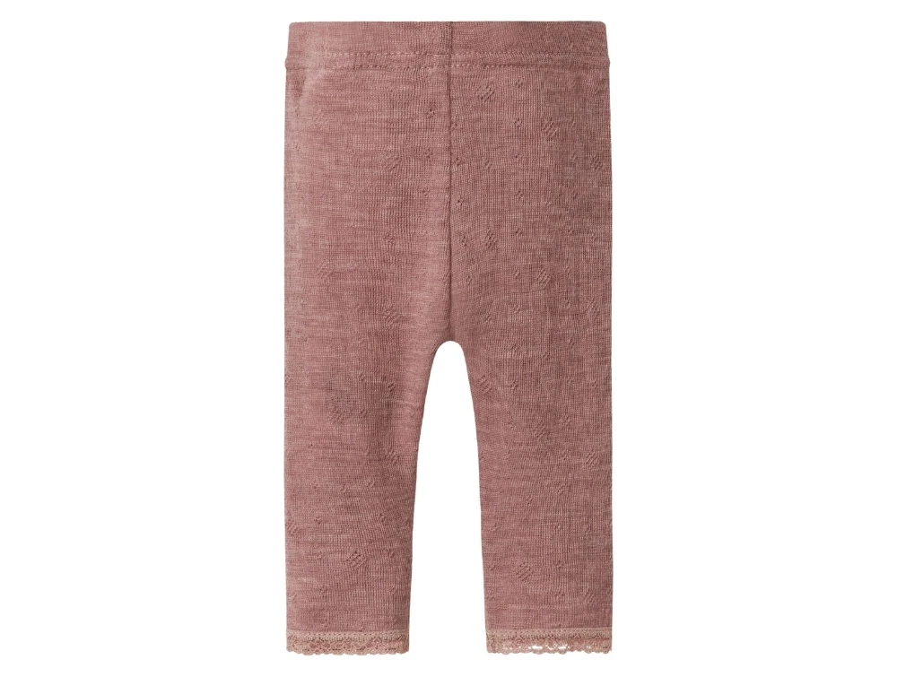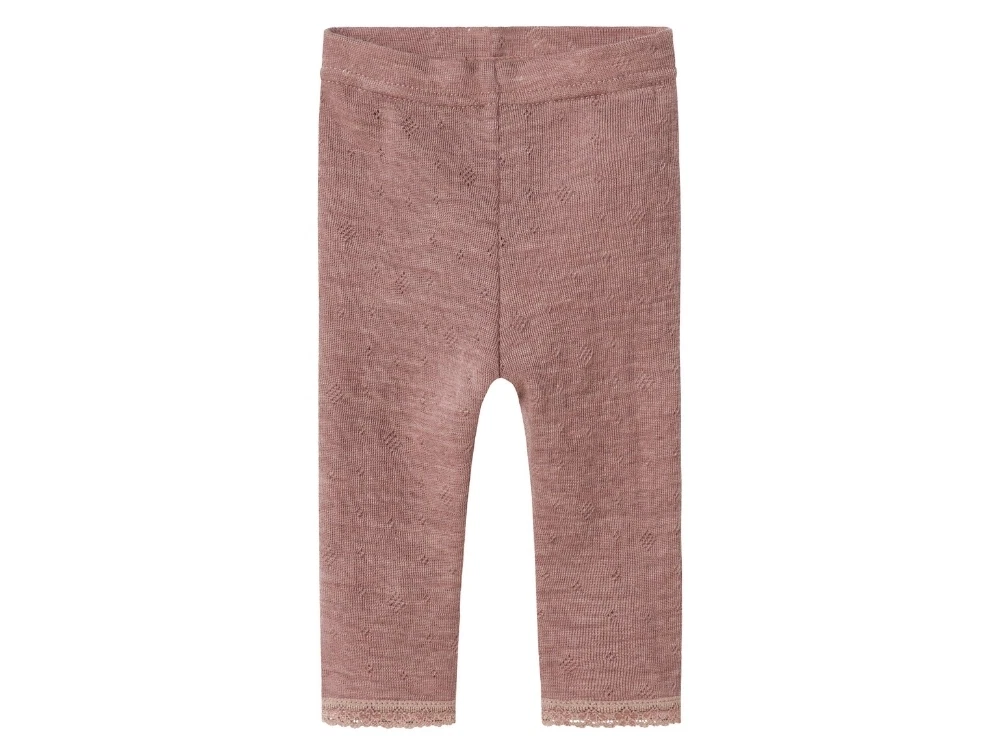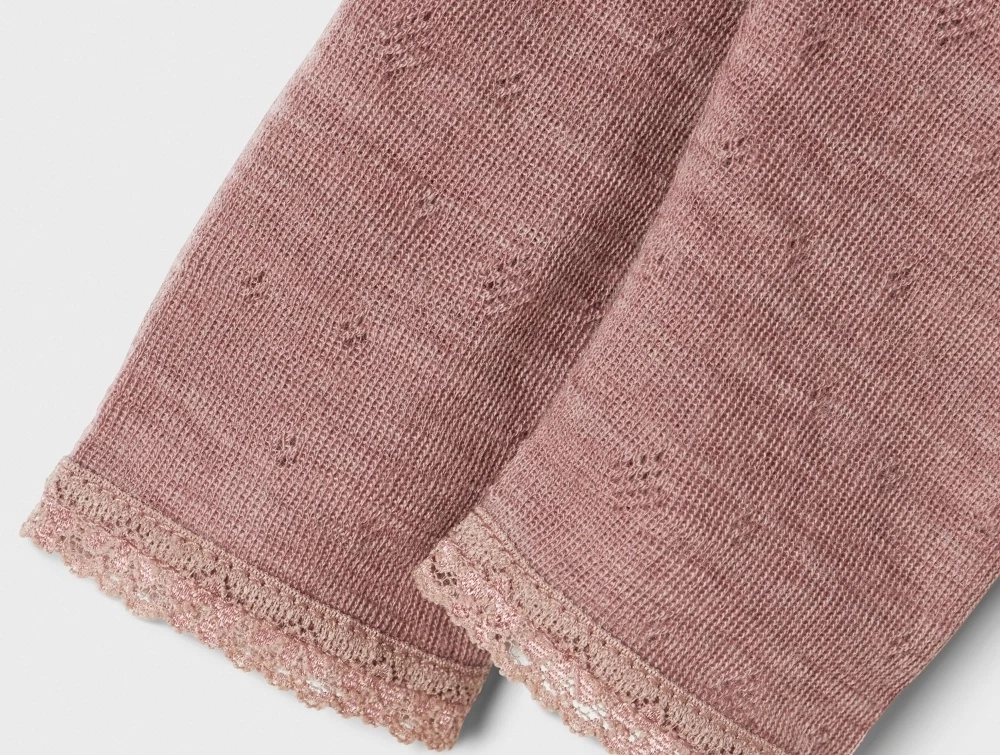 Leggings i støvet violet nuance (antler) fra Name It i merinould med hulmønster og blondekant.