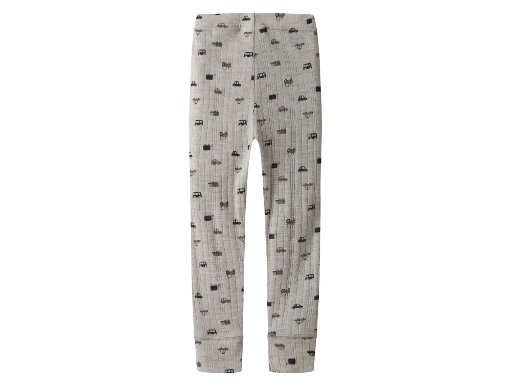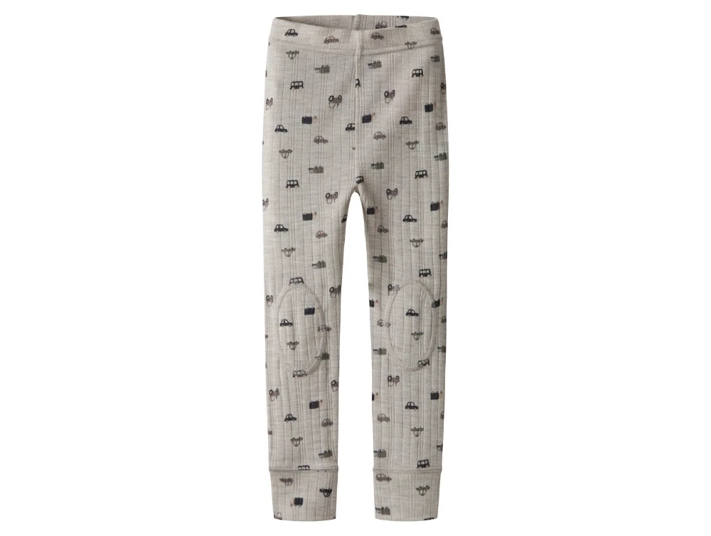 Leggings i lys grå nuance (nacreous cloud) fra Name It i ribstrikket merinould med små bilprint.