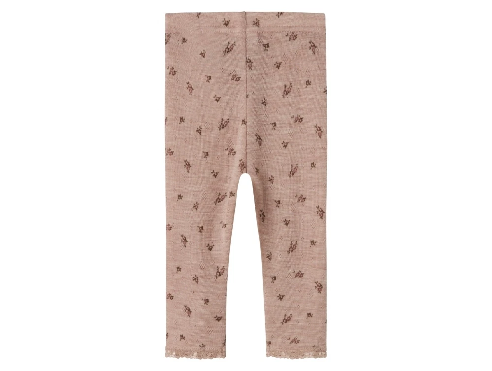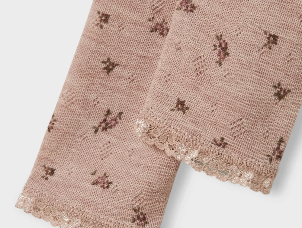 Name It leggings i støvet rosa nuance med blomsterprint og hulmønster i merinould