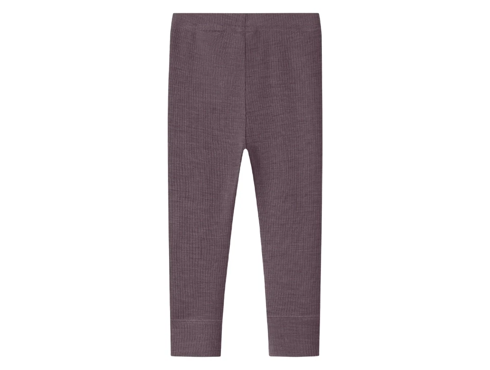 Leggings i mørk lilla nuance (sparrow) fra Name It i merinould med ribmønster.
