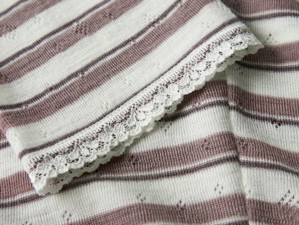 Name It leggings i støvet violet og råhvid i merinould med striber og blondekant