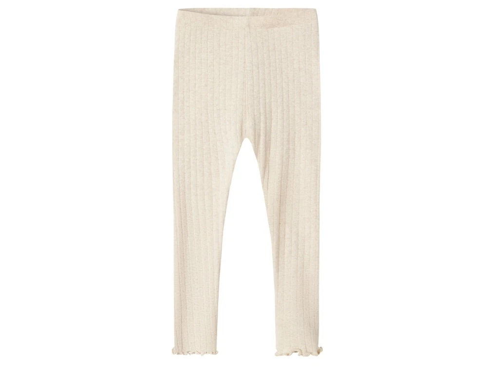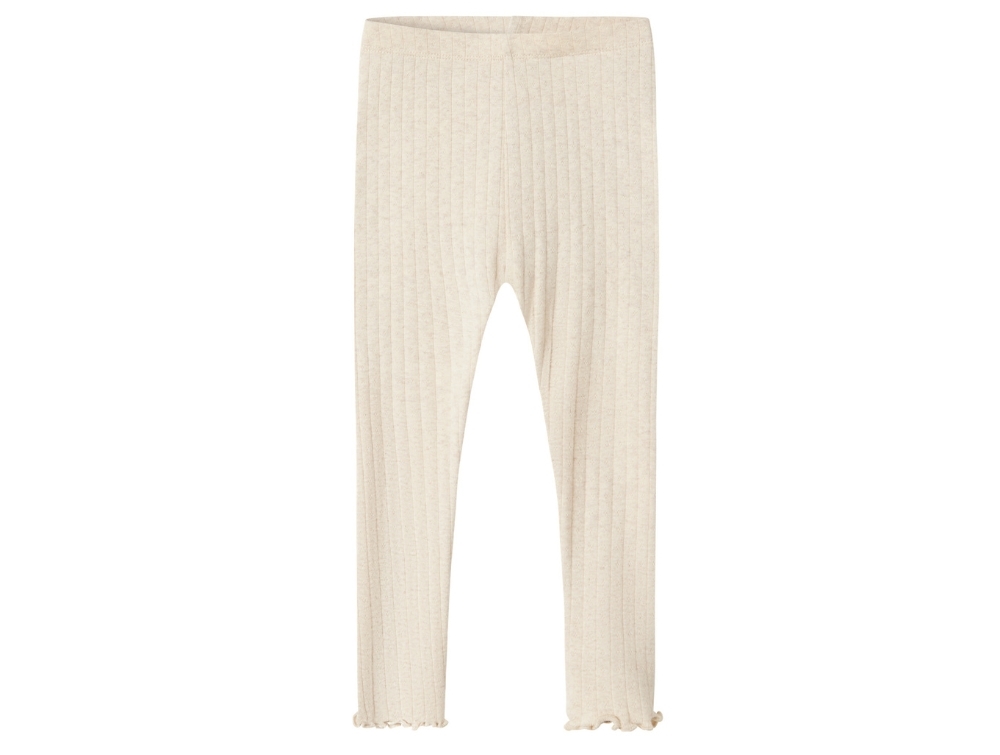 Leggings i råhvid nuance (peyote melange) fra Name It med fine bølgede babylock-kanter ved benene.