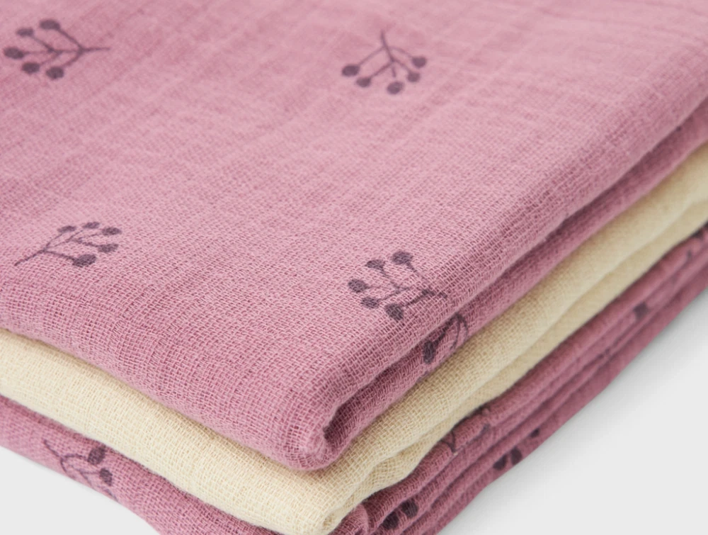Pakken indeholder to stofbleer i farven mauve orchid med print og én stofble i beige nuance.