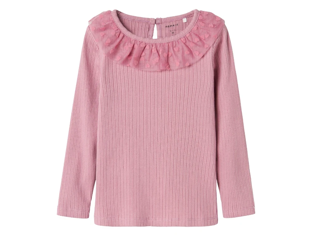 Langærmet top/bluse i farven mauve orchid med tylflæse med hjerter fra Name It.
