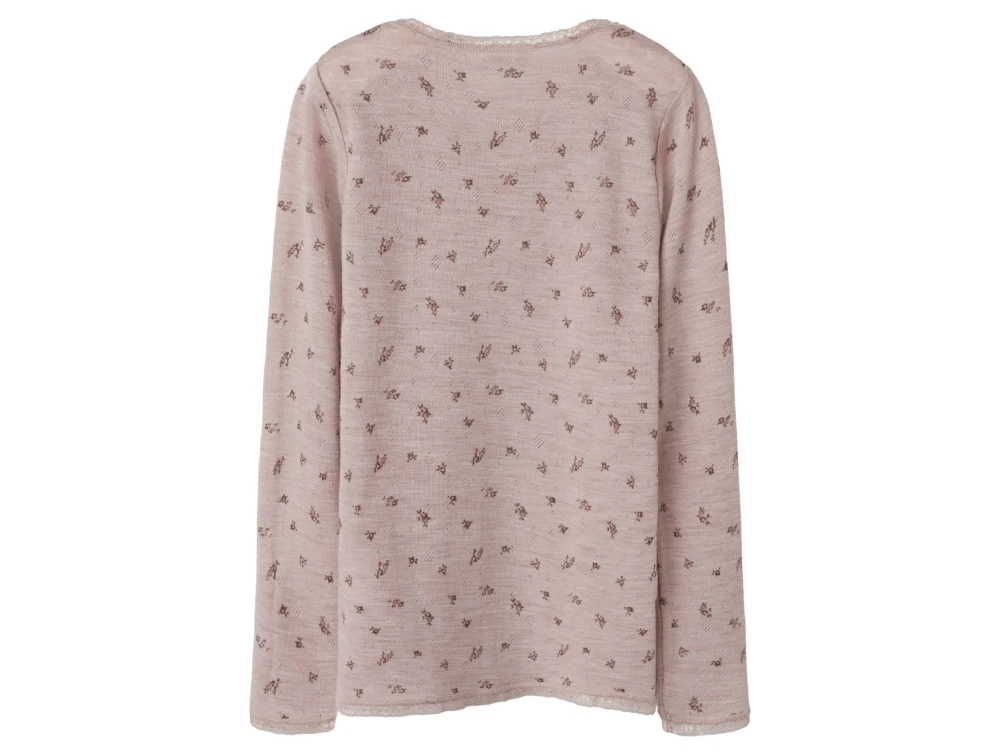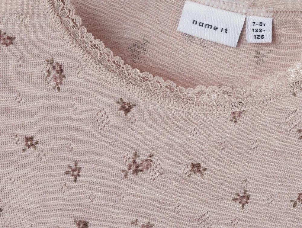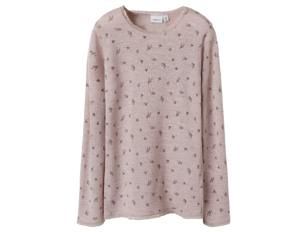 Langærmet bluse i meleret rosa nuance (shadow gray) fra Name It, fremstillet i 100% merinould med blondekant og blomsterprint.