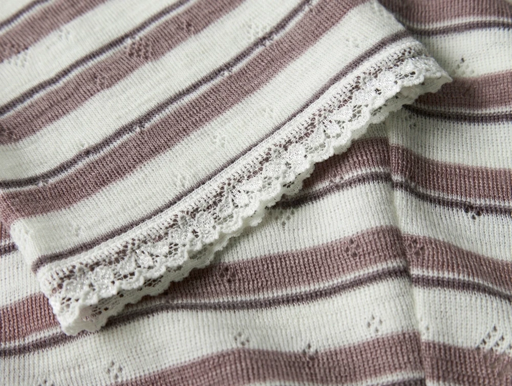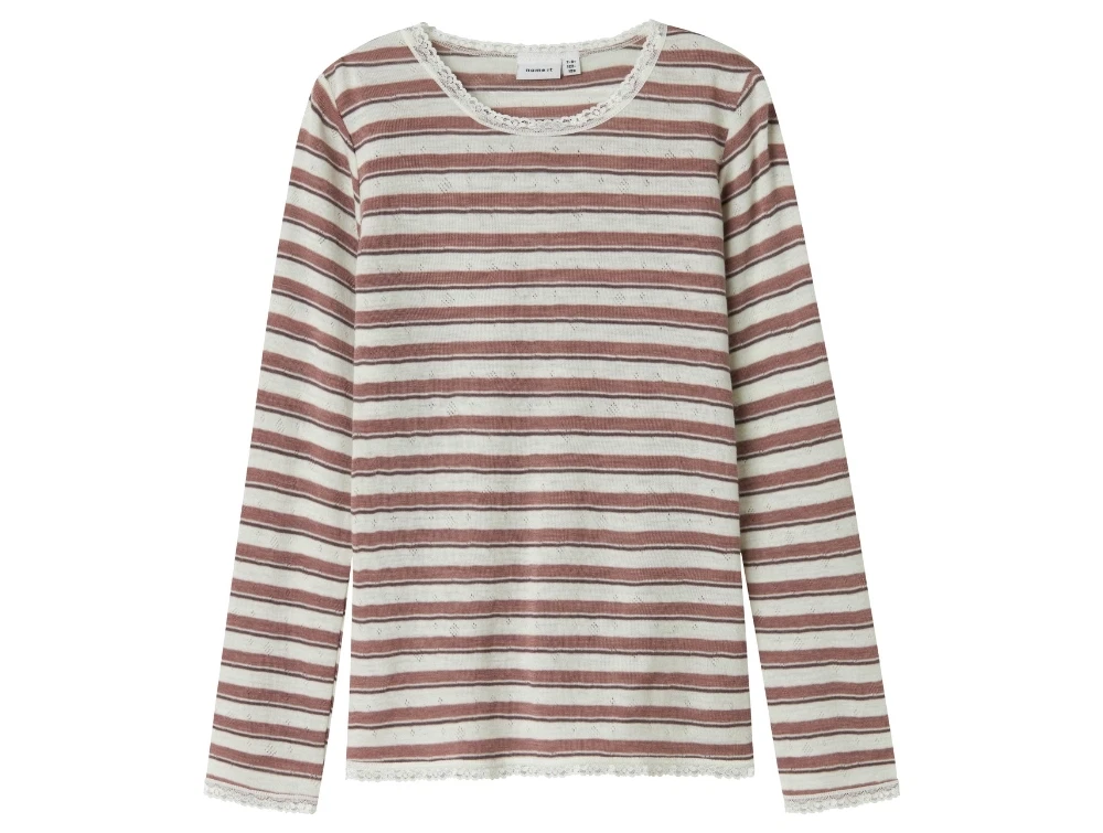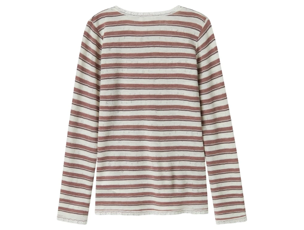 Langærmet bluse med striber i støvet violet (antler) og råhvid (snow white) fra Name It, fremstillet i 100% merinould med blondekant.