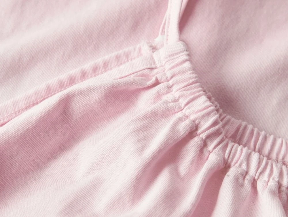 name it midi dress i lyserød med tynde stropper og buet kant, set forfraname it midi dress i lyserød med buet kant og sløjfe i ryggen, set bagfranærbillede af elastikkant og struktur i lyserød name it kjole