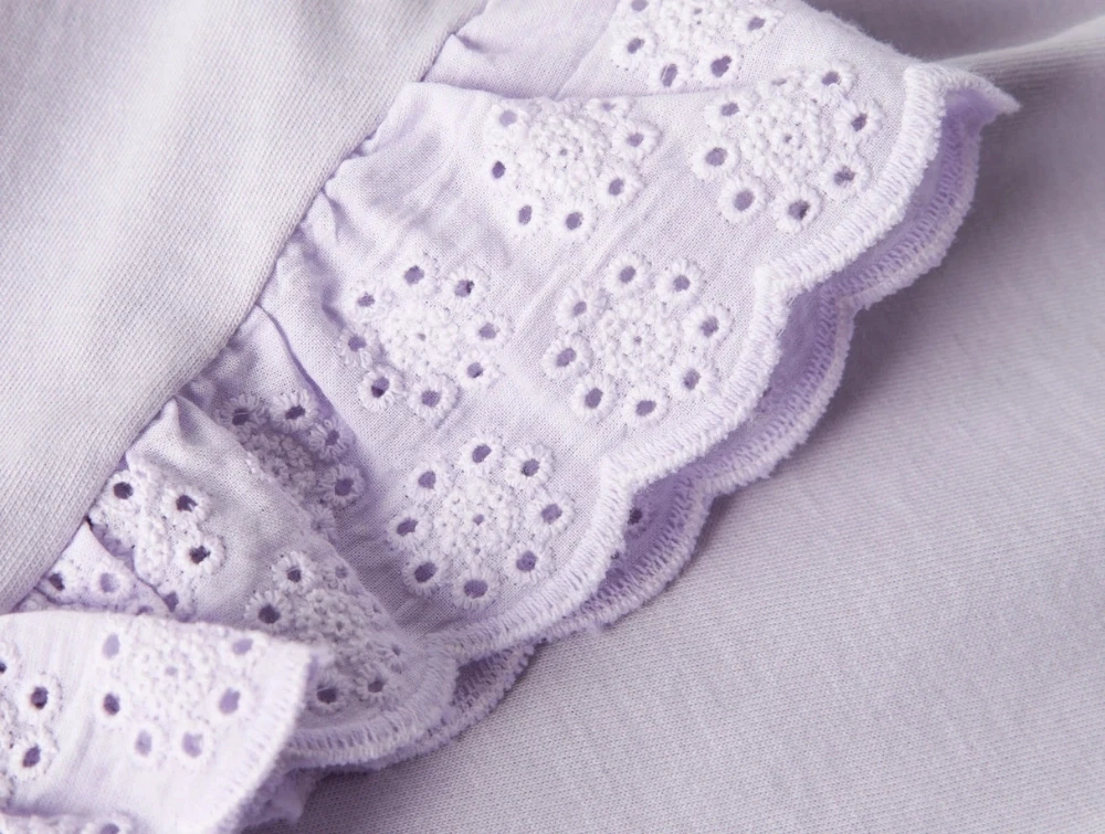 Modellen har korte flæseærmer med fine broderede detaljer og rund hals.